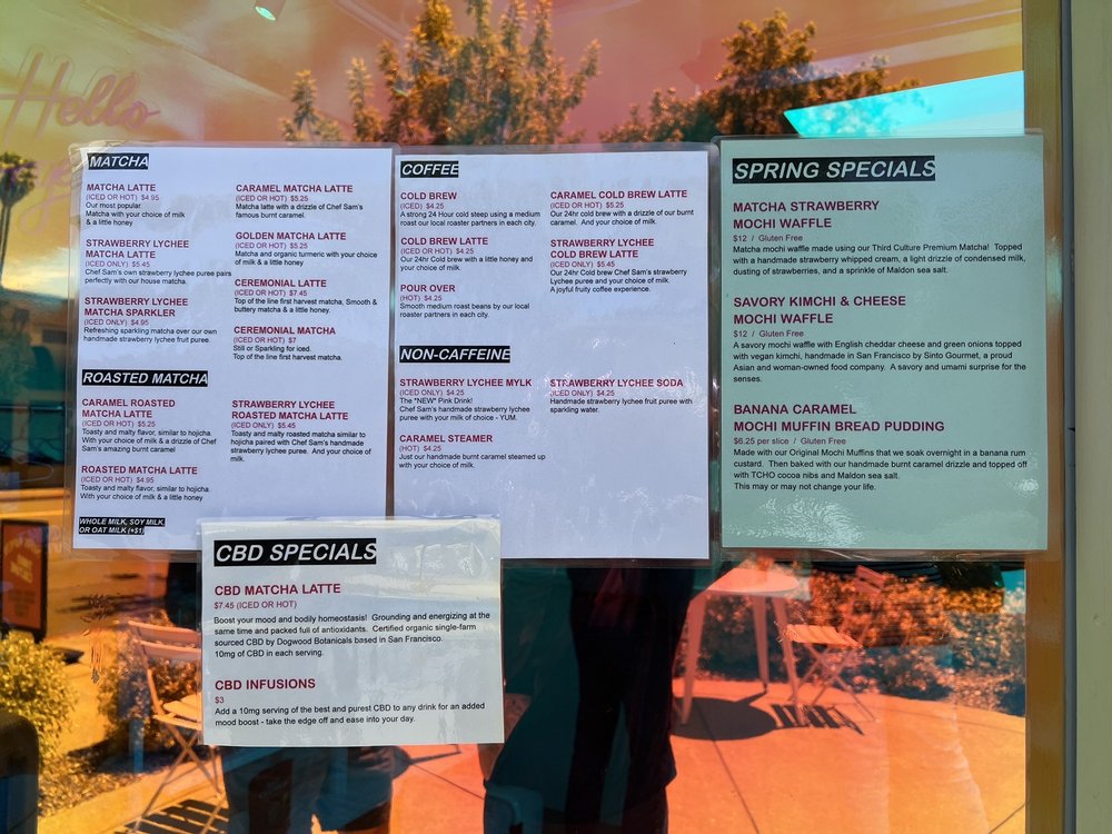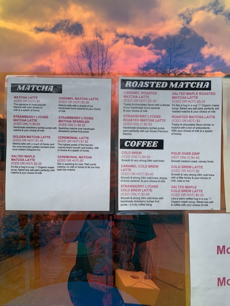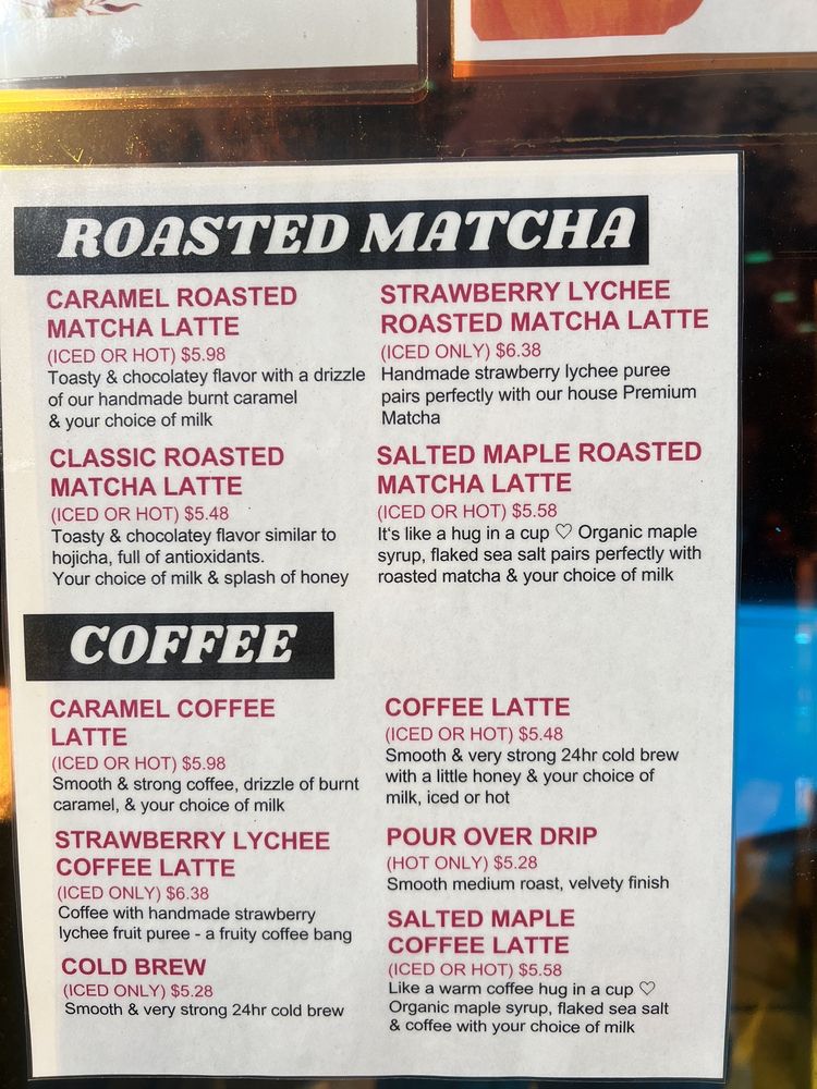 Oven-roasted matcha green tea straight from the farm in Uji Kyoto - creamy, chocolatey, malty flavor with all the benefits, and antioxidants of matcha. 16 oz iced with your choice of whole milk or organic unsweetened soy milk and a little touch of honey.