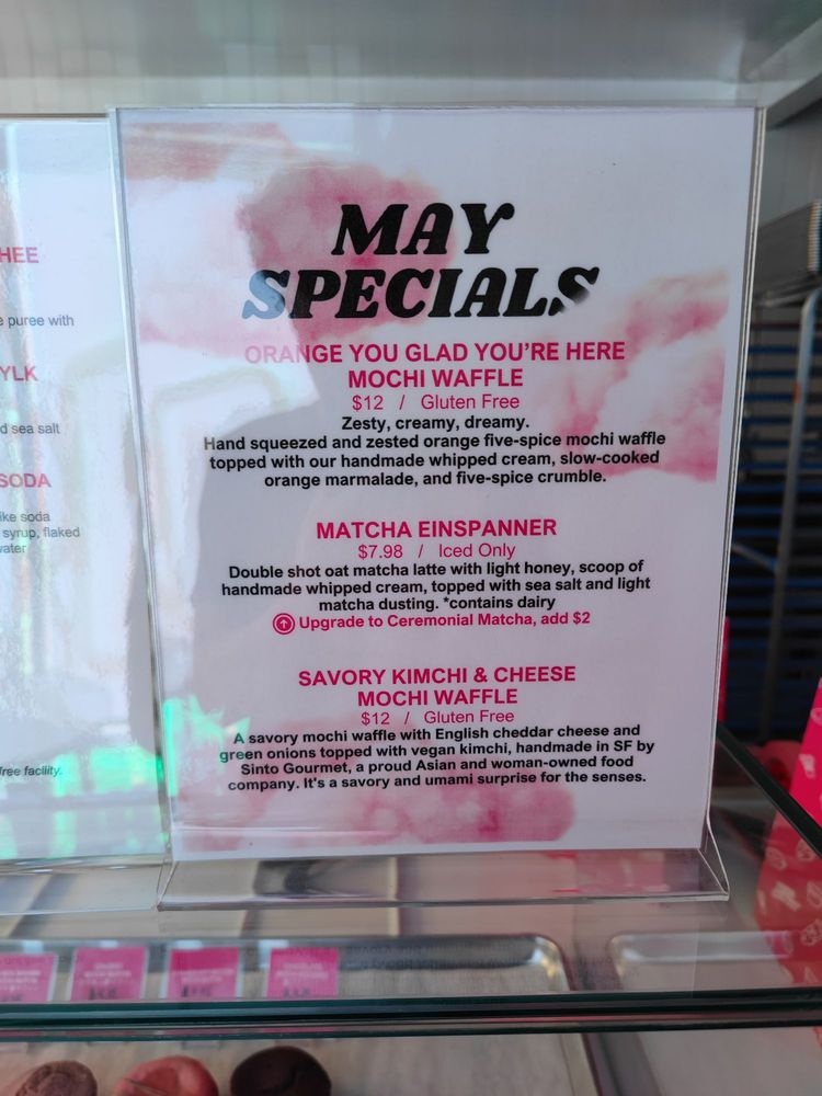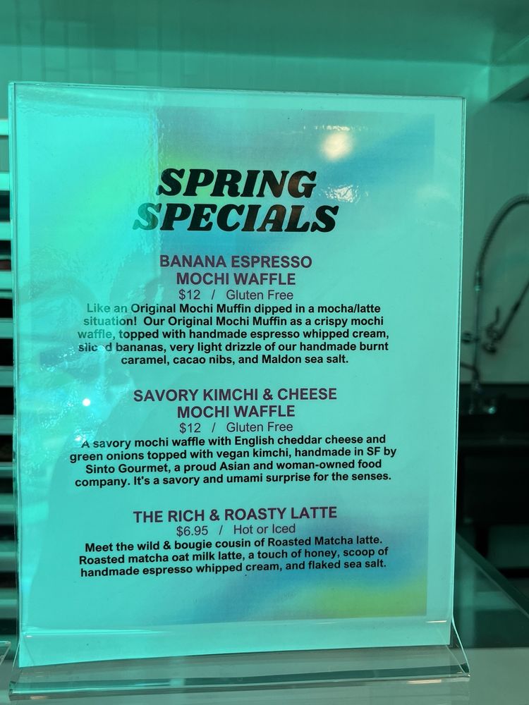 This is a Chef's choice of our signature Mochi Muffins! Daily rotation of available flavors of other Mochi Muffins® in flavors like Black Sesame, Uji Matcha, Churro, Ube, and Chocolate Mochi Brownie. Our Mochi Muffins® exclusively uses California-grown mochiko rice flour from the prestigious Koda Farms, organic French-style butter, and carefully sourced ingredients like black sesame seeds from an 11th generation farm in Japan, Matcha straight from Uji Kyoto, Traditional Mexican Canela Cinnamon, and more.Pro-Tip: They're even better warmed up! ***Contains butter, eggs, dairy milk, and coconut.